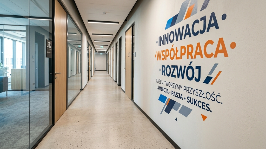 Nowoczesny nadruk UV nadaje ścianie wyjątkowy charakter, podkreślając tożsamość firmy. Idealne rozwiązanie dla przestrzeni korporacyjnych, które chcą łączyć funkcjonalność z designem.