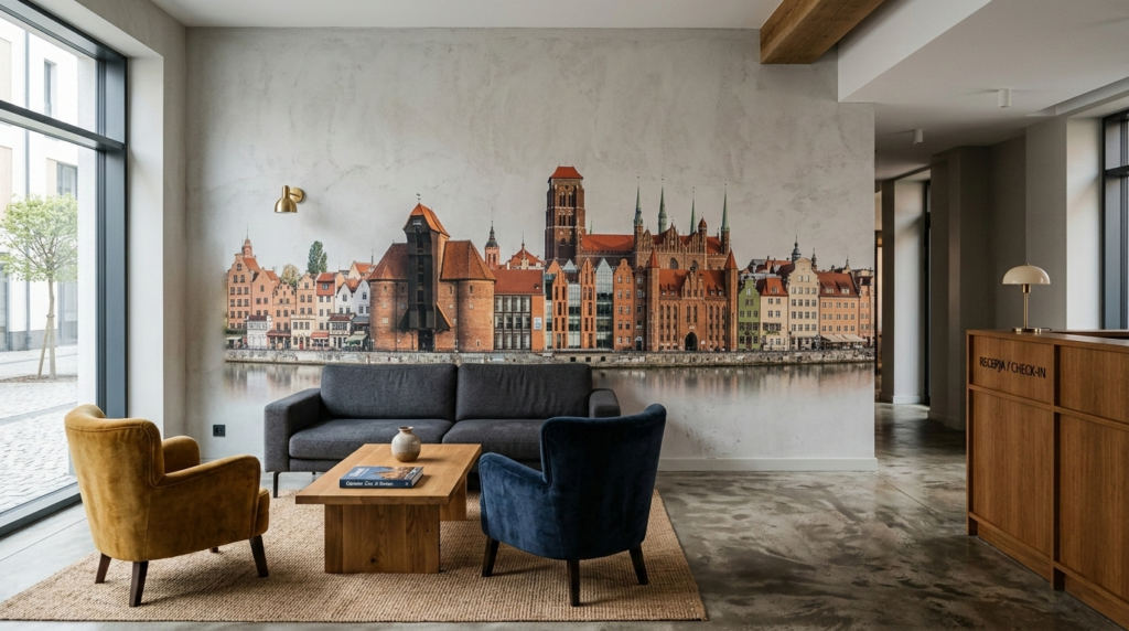 Subtelny nadruk na ścianie w hotelu tworzy elegancką i przyjazną atmosferę dla gości. Rozwiązanie doskonale sprawdza się w lobby, korytarzach czy pokojach gościnnych.