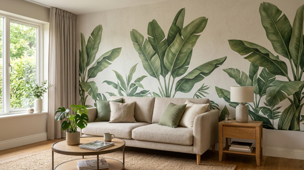 grafika drukowana bezpośrednio na ścianie, bez widocznych łączeń jak w tapetach.